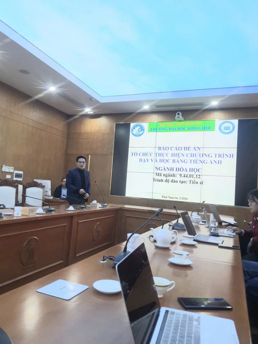 Chiều ngày 11/02/2026, tại Đại học Thái Nguyên, Trường Đại học Khoa học – Đại học Thái Nguyên đã tổ chức báo cáo các điều kiện thực hiện chương trình đào tạo trình độ Tiến sĩ giảng dạy hoàn toàn bằng tiếng Anh đối với hai ngành Hóa học và Hóa sinh học.