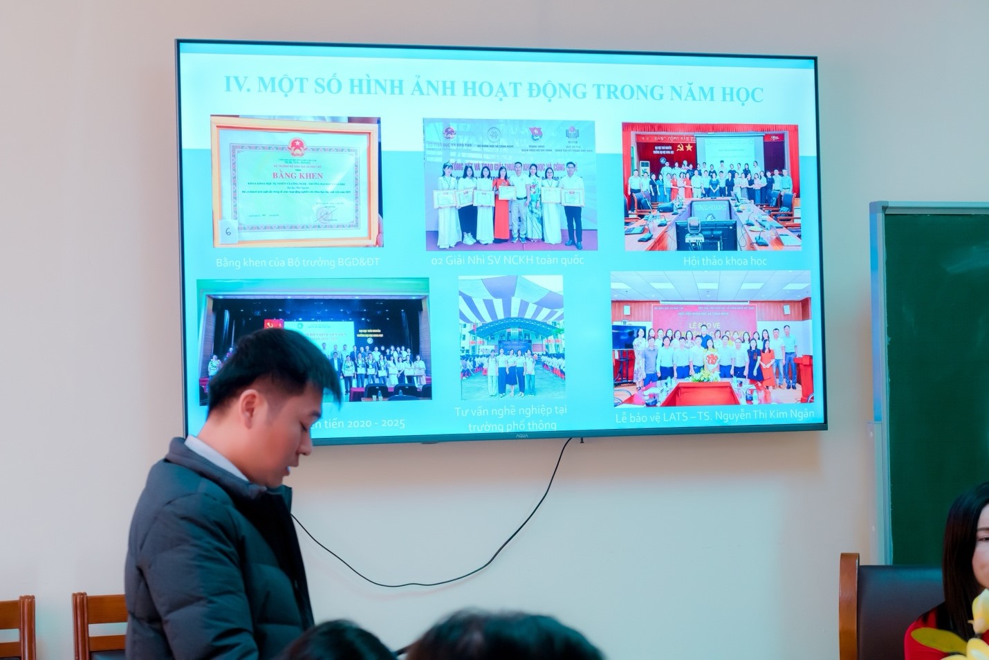 Tại hội nghị, PGS.TS. Bùi Minh Quý – Trưởng khoa – đã trình bày báo cáo tổng kết các thành tích nổi bật trong năm học 2025 và giới thiệu dự thảo phương hướng hoạt động năm 2026. Trong công tác đào tạo, khoa đã thực hiện 4.570,5/4.000 giờ giảng, đạt 114% so với đăng ký; 100% cán bộ đứng lớp hoàn thành và vượt giờ giảng dạy. Khoa đã xây dựng 2 chương trình đào tạo mới (KHTN tích hợp STEM và CSSĐ từ dược liệu) và cập nhật một chương trình đào tạo Công nghệ Sinh học, Hóa dược.